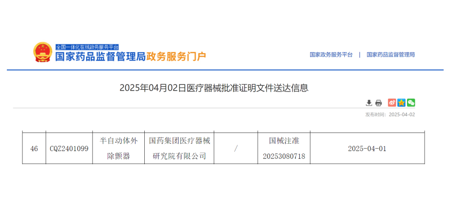 为民众生命健康保驾护航国药器械研究院AED获准上市近日,国药集团医疗器械研究院设计研发的半自动体外除颤器(AED)正式获批国家药品监督管理局颁发的医疗器械三类注册证(国械注准20253080718)。