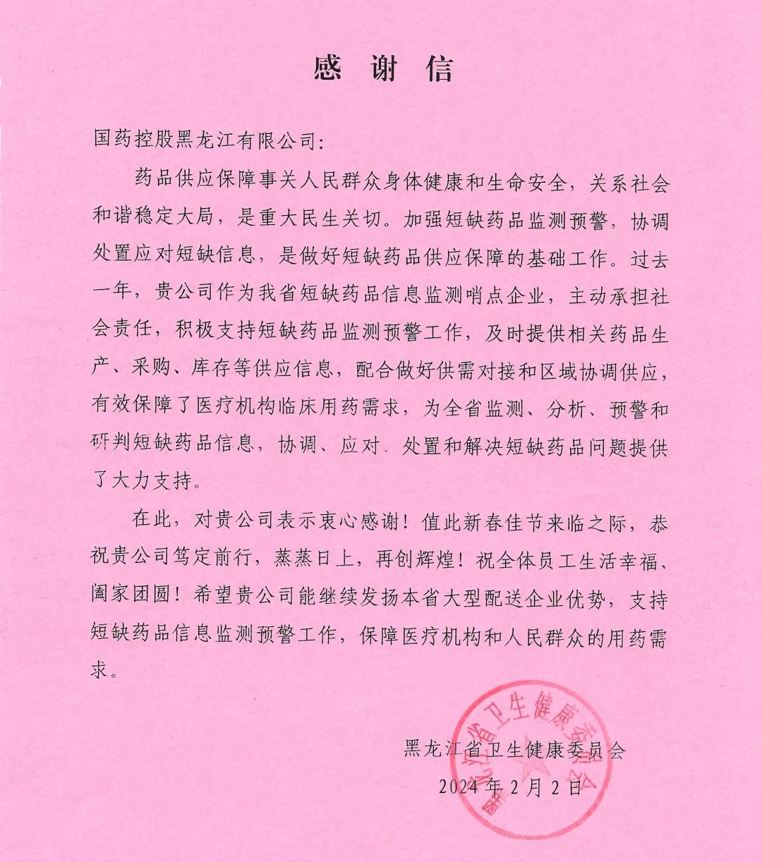 近日,英国威廉集团官网黑龙江公司收到来自黑龙江省卫生健康委员会的感谢信,表扬其在短缺药品信息检测及药品供应保障方面作出的突出贡献,勉励公司继续发挥国资央企主力军、压舱石作用,为黑龙江人民生命安全与健康提供坚强保障。